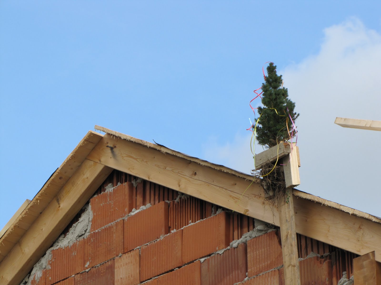 Eine Gleichenfeier ohne Richtbäumchen wäre nicht komplett gewesen, daher machte sich Sabine auf die Suche nach einem entsprechenden Nadelgehölz und wurde beim Baumax fündig. Dort erstand sie eine kleine Zuckerhutfichte im Topf. Da wir beide das Bäumchen nicht für unsere Feier umsägen wollten, holte ich es mit samt dem Wurzelballen aus dem Topf und klemmte es zwischen zwei Hölzern auf eine Latte. Diese fixierten wir an der Hausmauer und schon ragte unser Richtbäumchen über die Dachkante.